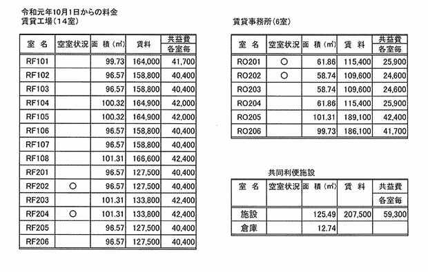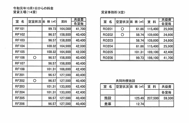※試作開発室(工場型・事務所型)は1uあたり419円の共益費が発生します。